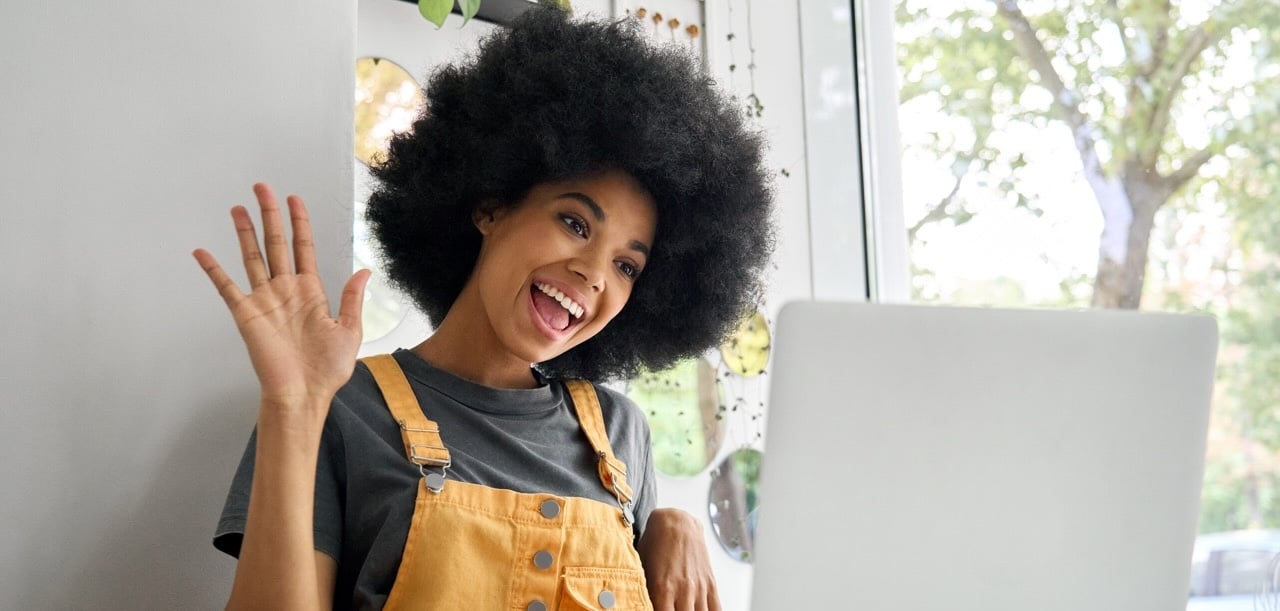 Smiling person waving while on a video call with a laptop near a bright window.